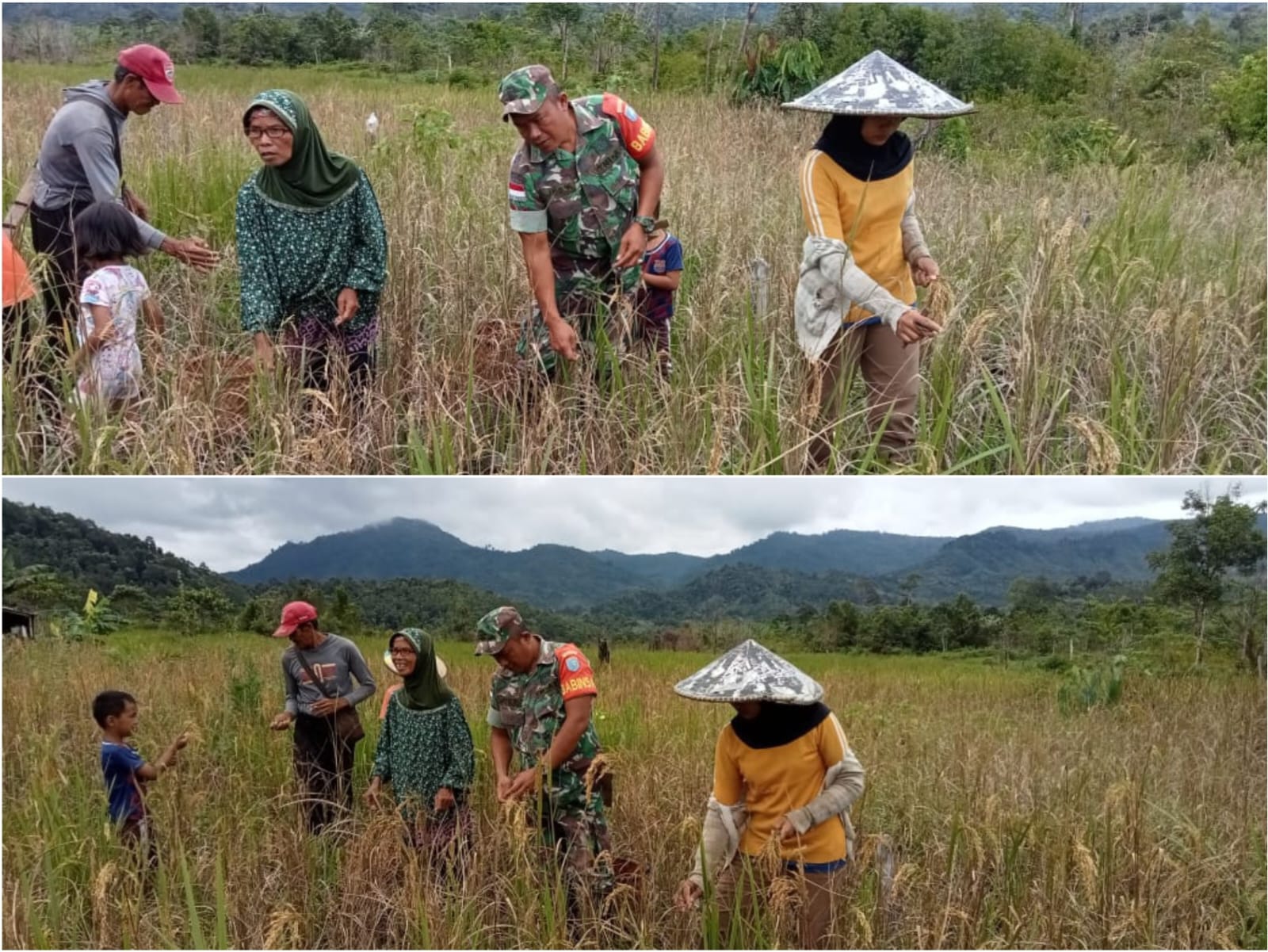 FOKUSPOST.COM | Putussibau – Babinsa Ramil 08/Bunut Hilir Kodim 1206/Putussibau Koptu Lili Jeri bersama ketua Poktan Buluh Permata Bunda bapak Mulyadi adakan panen padi bersama yang berada di desa Nanga Sangan kecamatan Boyan Tanjung kab. Kapuas Hulu, Senin, 27/2/2023.